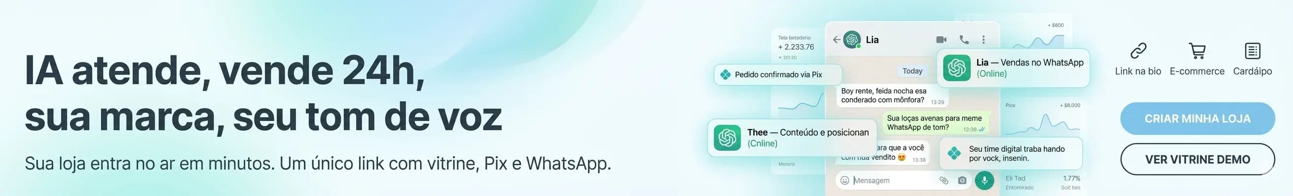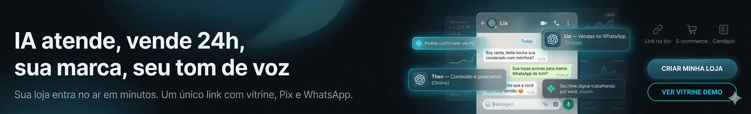 No mesmo link, voce escolhe a vitrine: Link na bio, loja com Pix ou cardapio no WhatsApp. IA vende e responde 24h no seu tom, com conteudo incluso.